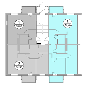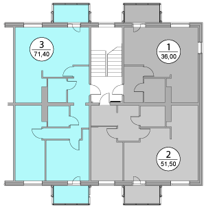 | 1 этаж | 1 1-комн. 36,0 м2 | 2 2-комн. 51,5 м2 | 3 3-комн. 71,4 м2 |